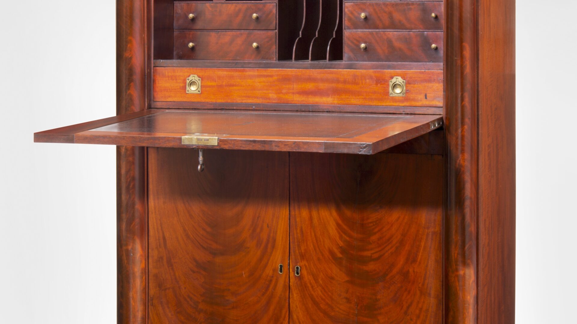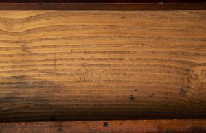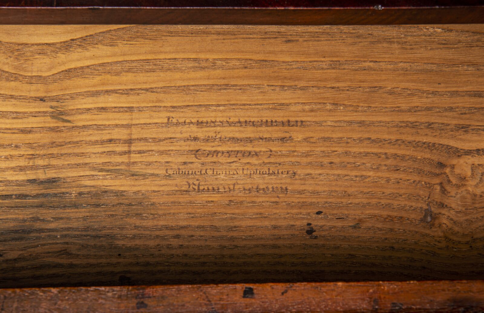 Label: Stenciled on the long drawer bottom in the interior, “EMMONS & ARCHBALD / No. 39 Orange Street / (BOSTON) / Cabinet, Chair & Upholstery / Manufactory.”