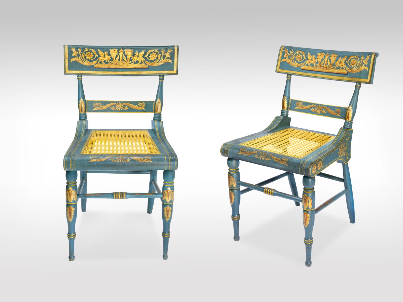 Surface treatments: painted decoration, stencil gilding, applied penwork, replacement caning