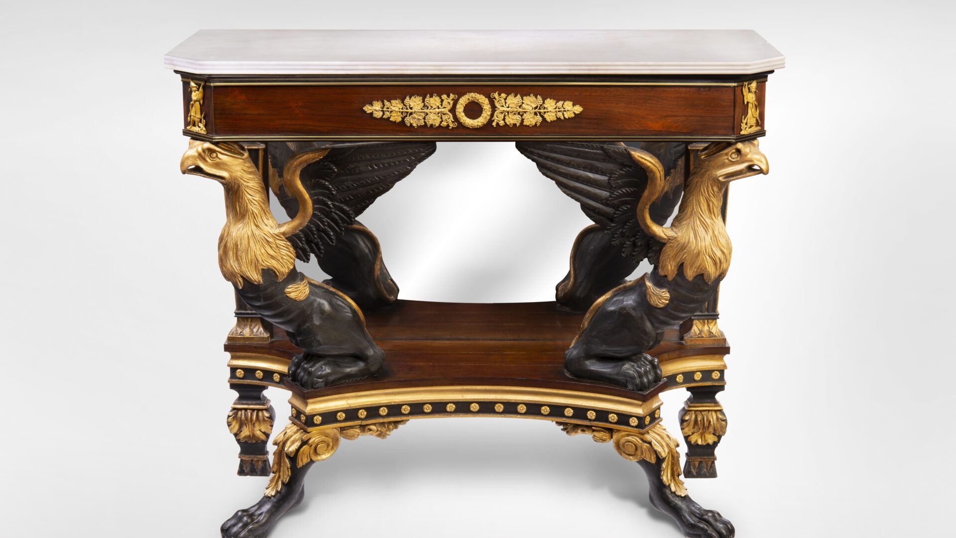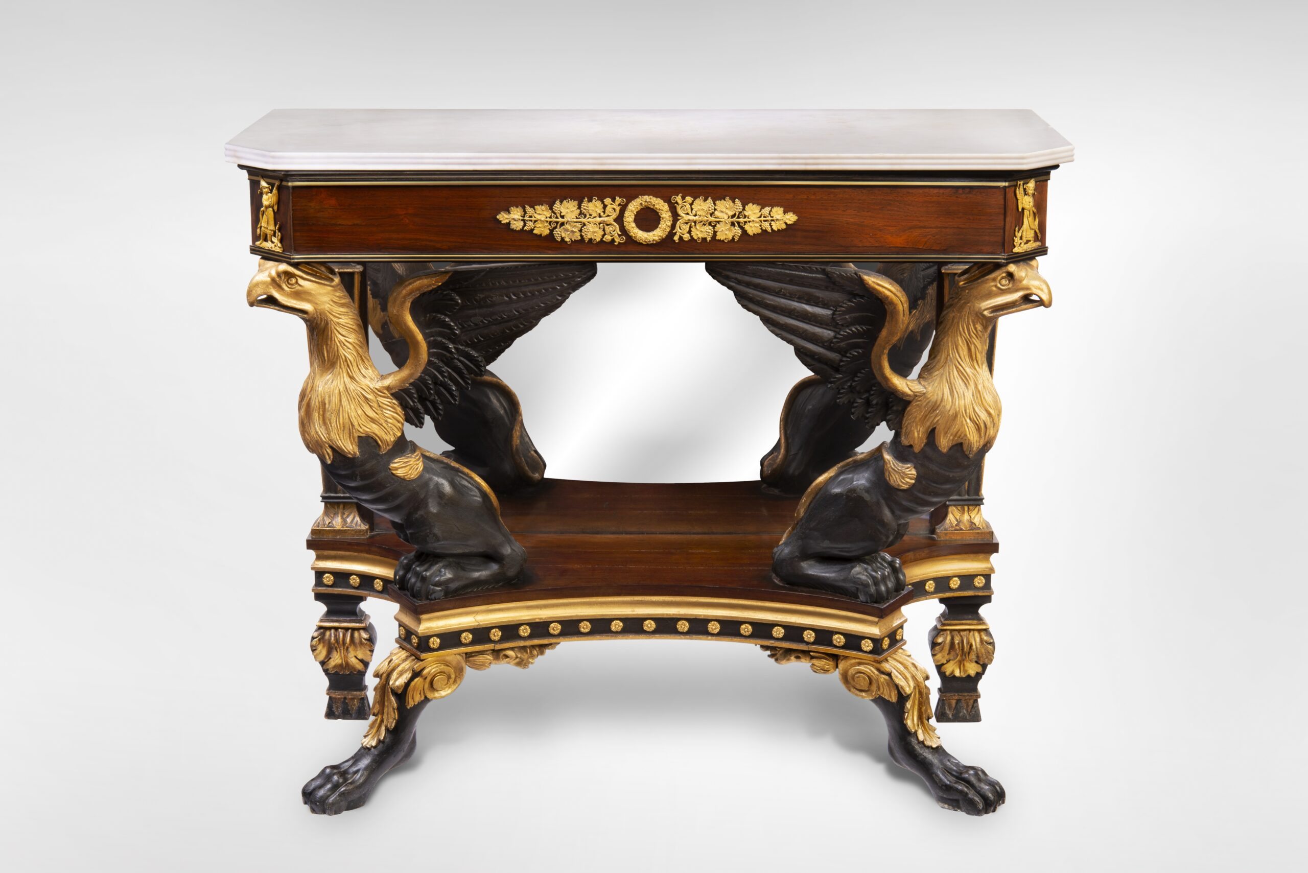 Surface treatments: gilded gesso, vert antique, gilded brass, marble, mirror glass