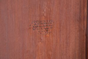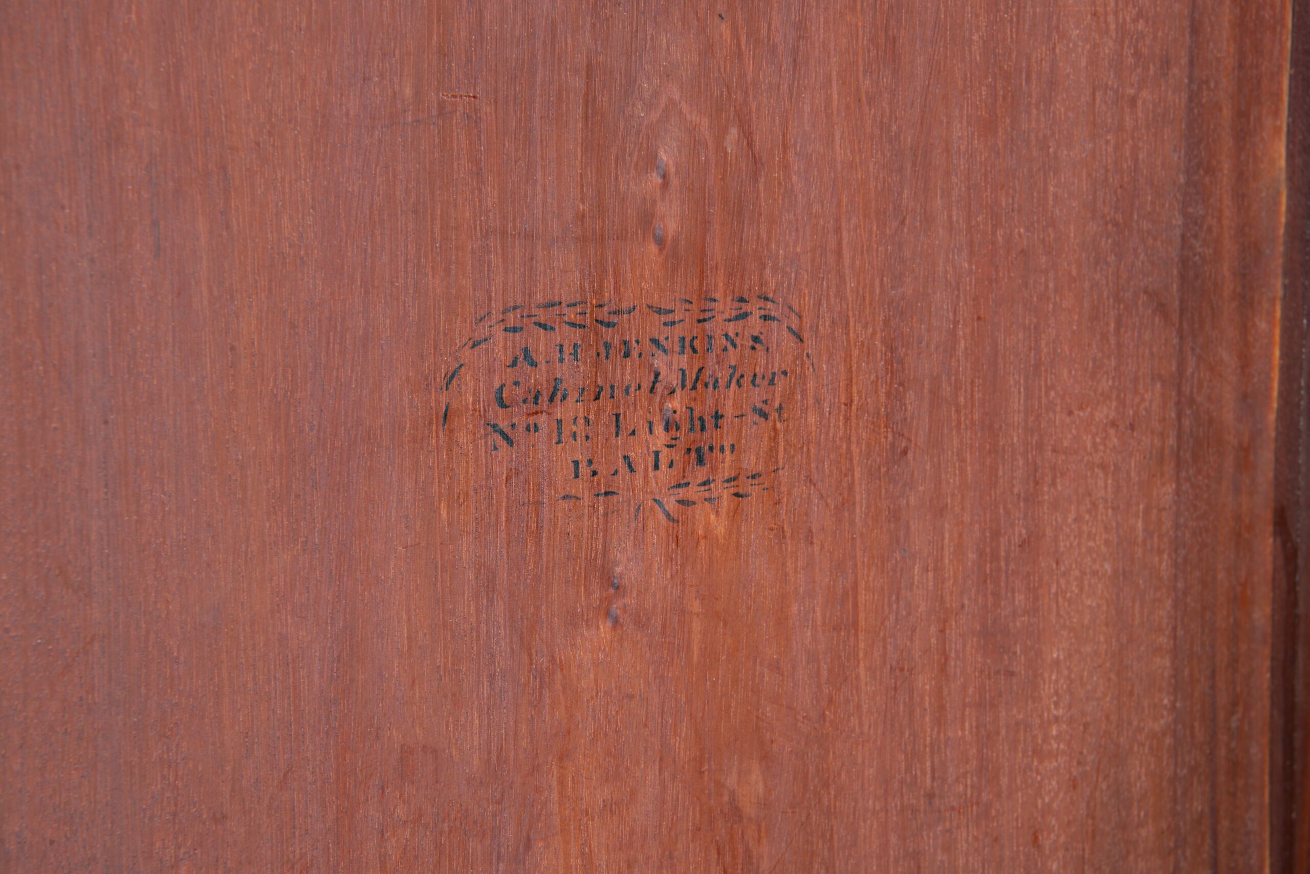 Stenciled within a wreath on the inside of each door: “A H Jenkins / Cabinet Maker / No. 18 Light St / Balt.”