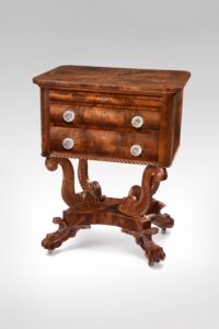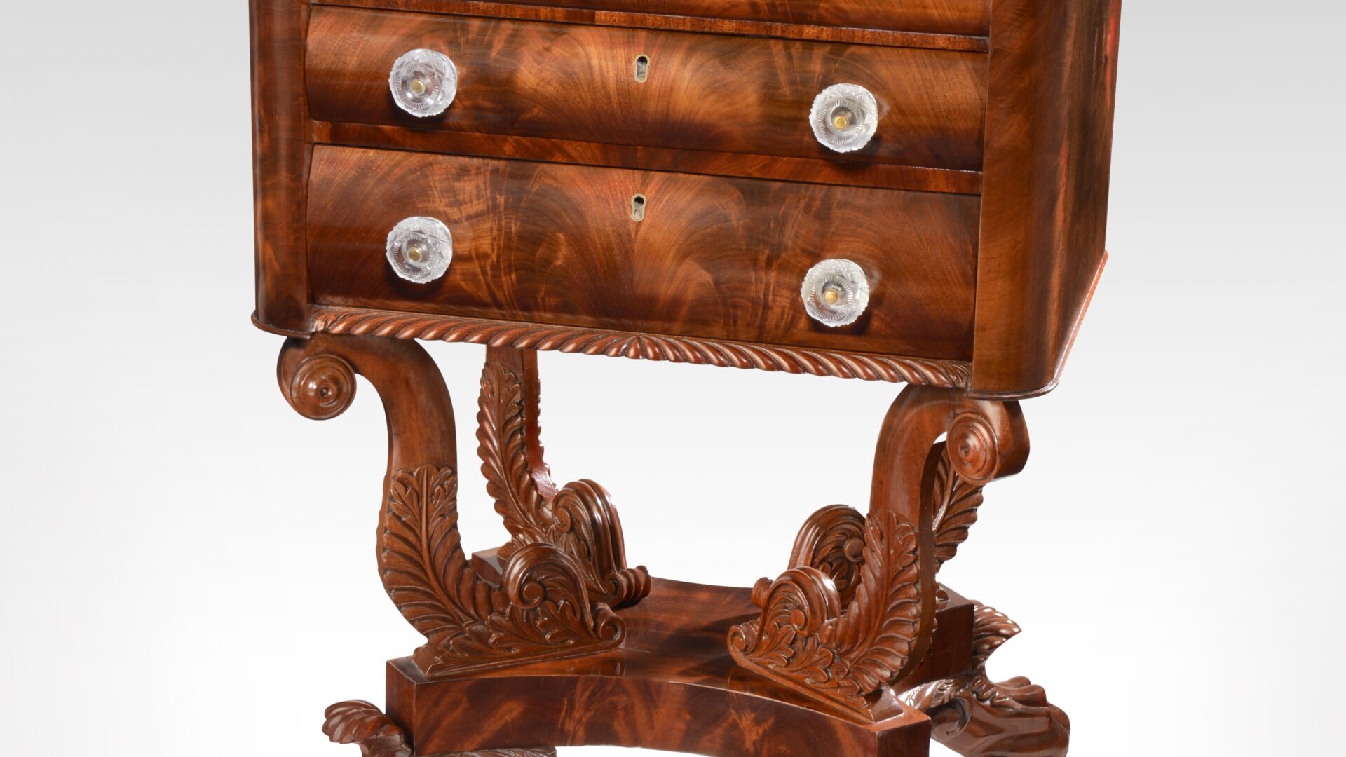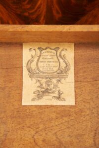 Pasted at the back of the top drawers: “A. G. QUERVELLE / United States / Fashionable / CABINET WAREHOUSE / NO 126 / South Second Street / Below Dock / PHILADELPHIA / Delmes Sculpt.”